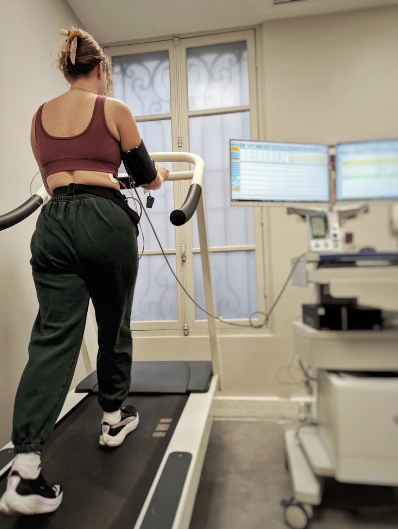 L’effort dure entre 5 et 15 minutes en fonction du protocole choisi et de la capacité physique du patient. Il est progressif, sur vélo ou sur tapis, et l’objectif est d’aller jusqu’au maximum de l’effort pour bien tester le coeur.
